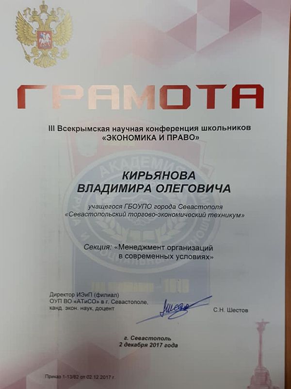 Представители всех регионов Крыма и города федерального значения Севастополя приняли участие в крупнейшем научном событии для учащихся полуострова – Третьей Межрегиональной научной конференции школьников «Экономика и право», организованной Институтом экономики и права (филиал) ОУП ВО «Академия труда и социальных отношений» в г. Севастополе. Студенты и учащиеся школ Севастополя, Ялты, Симферополя, Джанкоя, Евпатории, многих других городов и населенных пунктов Крыма представили на конференции 60 докладов, в которых продемонстрировали не только умение выбирать и анализировать материал, формулировать выводы, но и творчески формировать собственные предложения по решению тех или иных экономических и правовых проблем полуострова, по реализации проектов в Крыму.