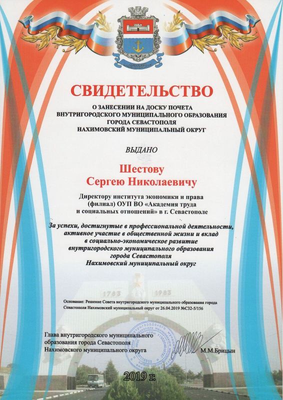 Решением Совета внутригородского муниципального образования города Севастополя Нахимовский муниципальный округ директор Института экономики и права (филиал) образовательного учреждения профсоюзов высшего образования «Академия труда и социальных отношений» в Севастополе Сергей Шестов занесен на Доску Почета Нахимовского района.