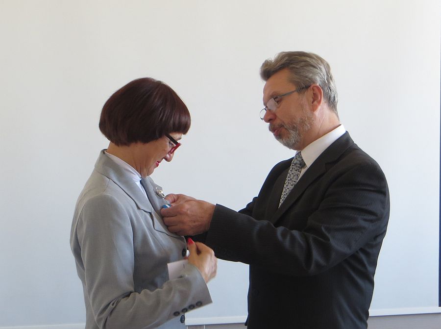За многолетний добросовестный труд, в связи с Юбилеем и 25-летием Института и 100-летием "головной" организации - Академии директор Института Сергей Шестов вручил Татьяне Штец медаль «25 лет основания Института экономики и права АТиСО».