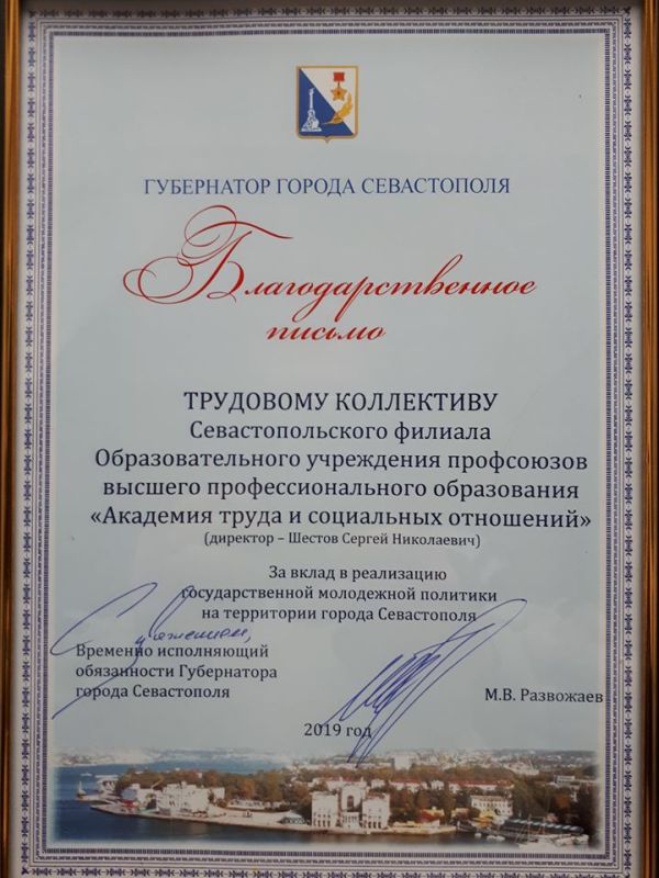 Временно исполняющий обязанности губернатора Севастополя Михаил Развожаев вручил Благодарственное письмо трудовому коллективу Института экономики и права (филиала) ОУП ВО «Академия труда и социальных отношений» в г. Севастополе «за вклад в реализацию государственной молодежной политики на территории города Севастополя».