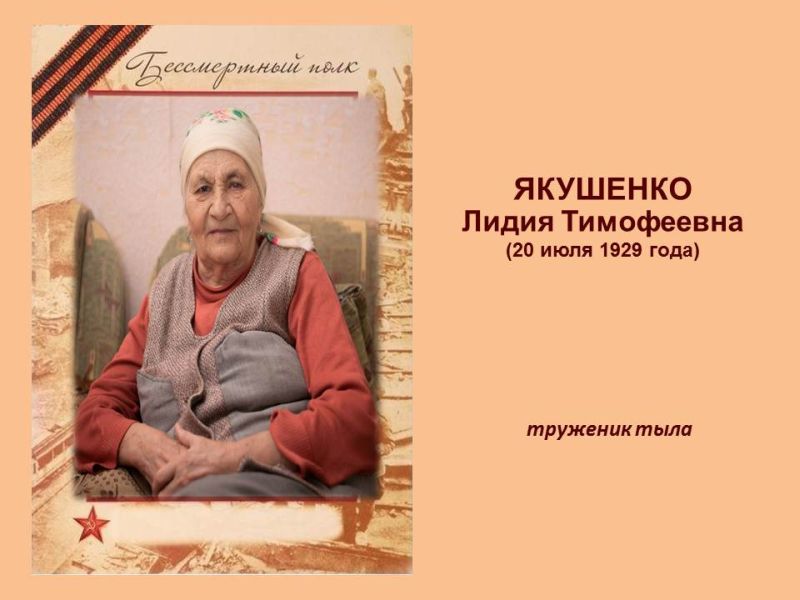 Моя прабабушка Якушенко Лидия Тимофеевна была подростком, когда началась война. У нее практически отобрали детство, и вместо этого дали огромные объемы непосильной работы в поле и дома.