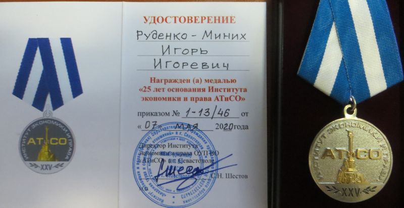 В связи с Юбилеем и в ознаменование 75-летия Великой Победы директор Института Сергей Шестов наградил Александра Моисеева медалью «25 лет основания Института экономики и права АТиСО», которая была отчеканена к 100-летию Академии труда и социальных отношений и 25-летию ее севастопольского филиала.
