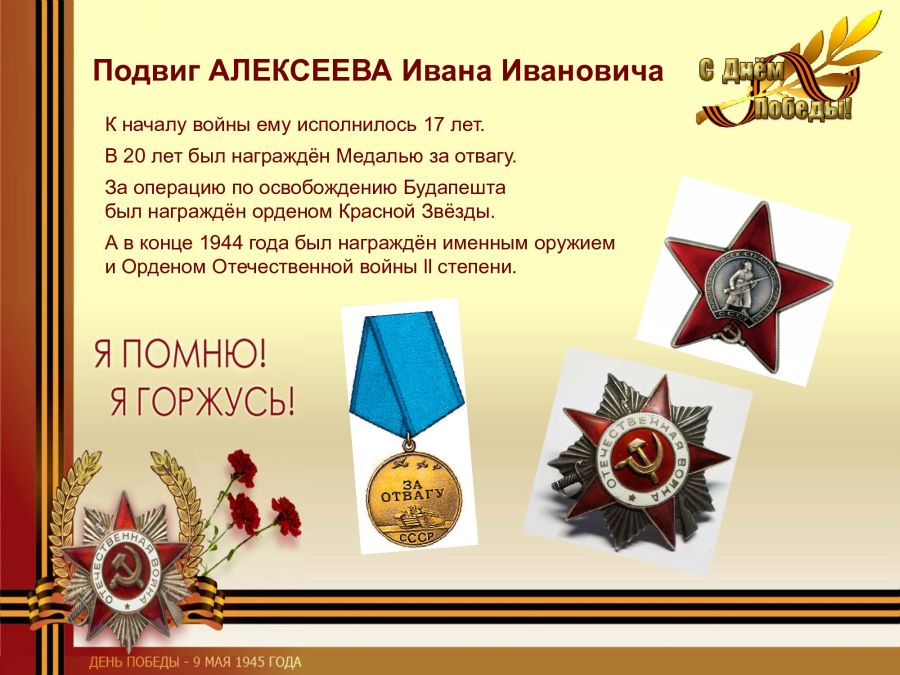 Мой дядя Алексеев Иван Иванович. 1924 г.р. родился в маленькой деревне Саратовской области. К началу ВОВ ему исполнилось 17 лет. Воевал в пехоте 2 Украинского фронта. Проявил мужество, отвагу в боевых операциях.