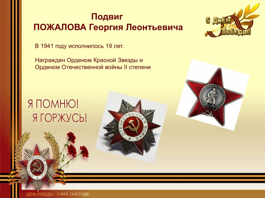 Пожалов Георгий Леонтьевич родился в 1922 году. Майор интендантской службы. Награждён Орденом Красной Звезды и Орденом Отечественной войны II степени.