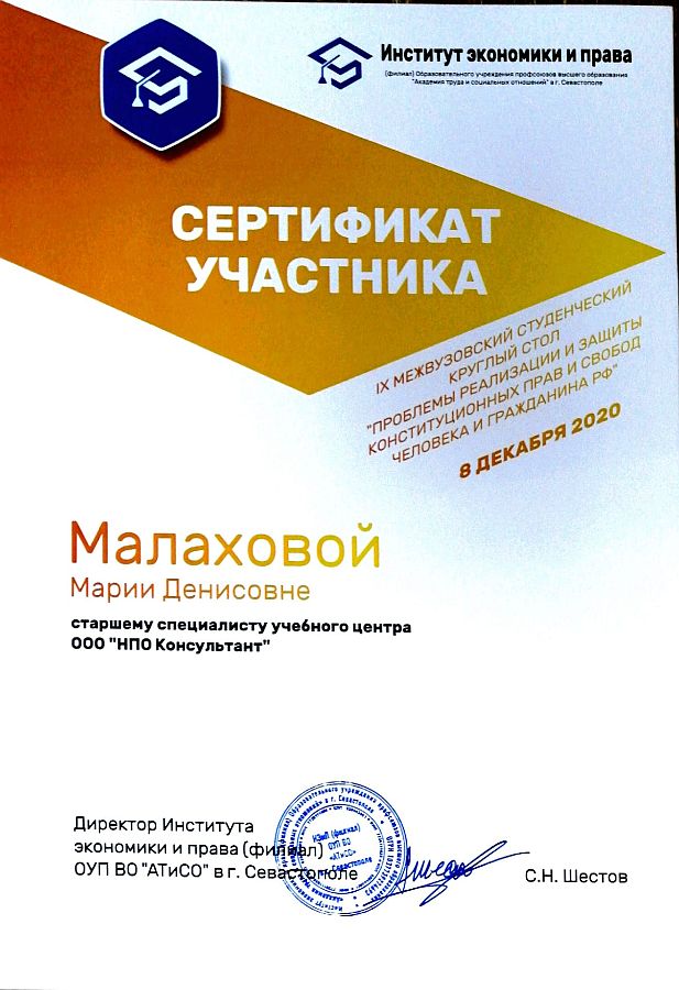 Директор Института экономики и права (филиала) ОУП ВО "Академия труда и социальных отношений" в г. Севастополе Сергей Шестов отметил именными сертификатами представителей постоянного партнера вуза в проведении научно-практических мероприятий - ООО "НПО Консультант", которое является разработчиком одноименной справочной правовой системы.