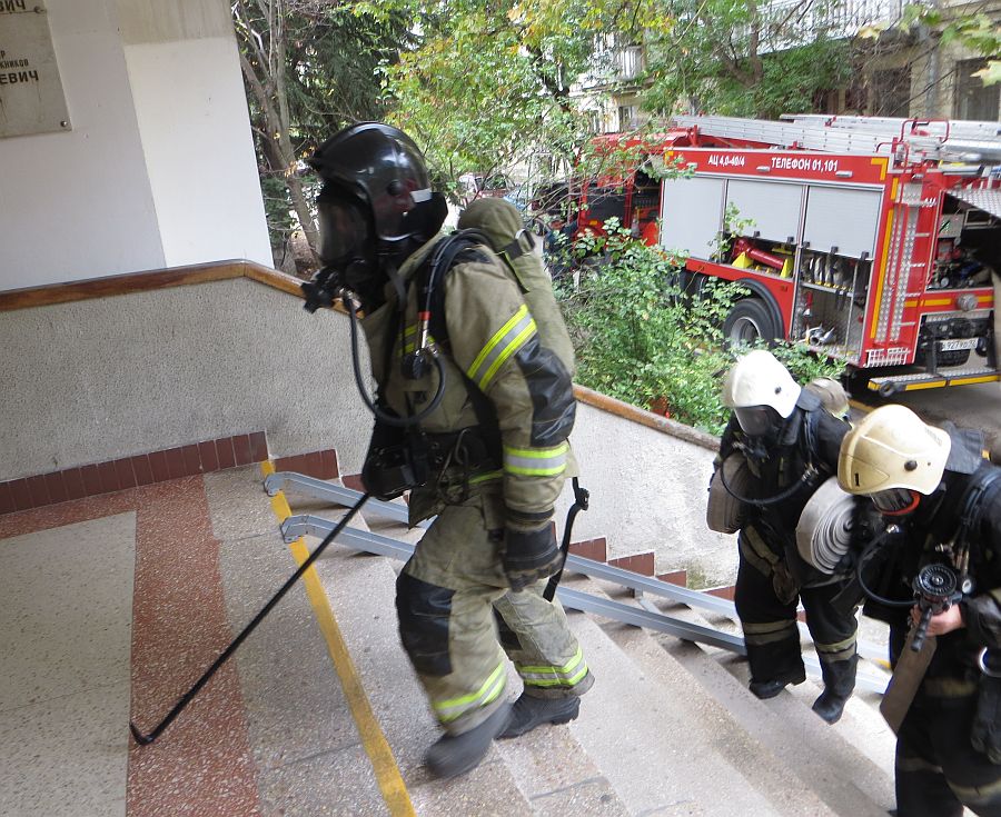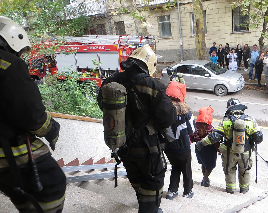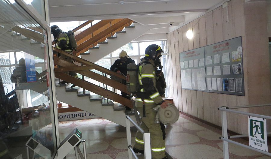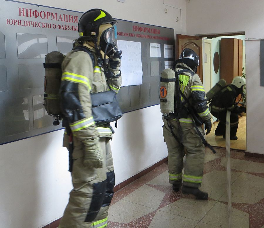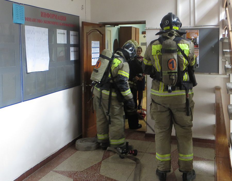 Звено газодымозащитной службы проводит разведку места возгорания.В одном из помещений обнаружены двое условных пострадавших. Бойцы МЧС эвакуируют их из здания с использованием специального оборудования. Студентам и сотрудникам еще раз напоминают, что по сигналу эвакуации они должны незамедлительно покинуть помещение.