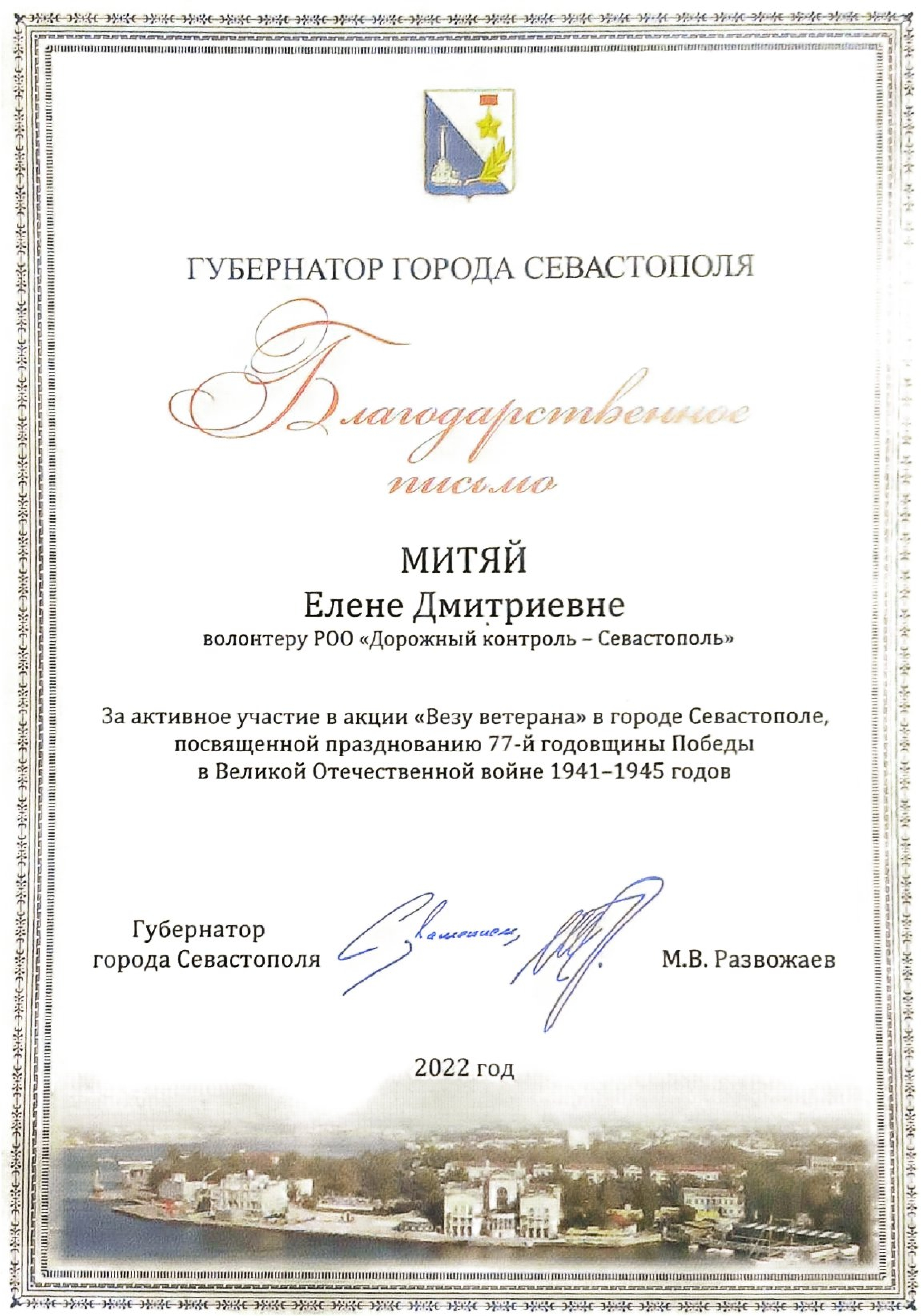 В субботу 10 декабря 2022 г. в помещении Регионального общественного добровольческого движения «Мы вместе – Севастополь» состоялось награждение волонтеров общественной организации "Дорожный контроль - Севастополь" за активное участие в акции "Везу ветерана" традиционно проводимую в нашем городе.