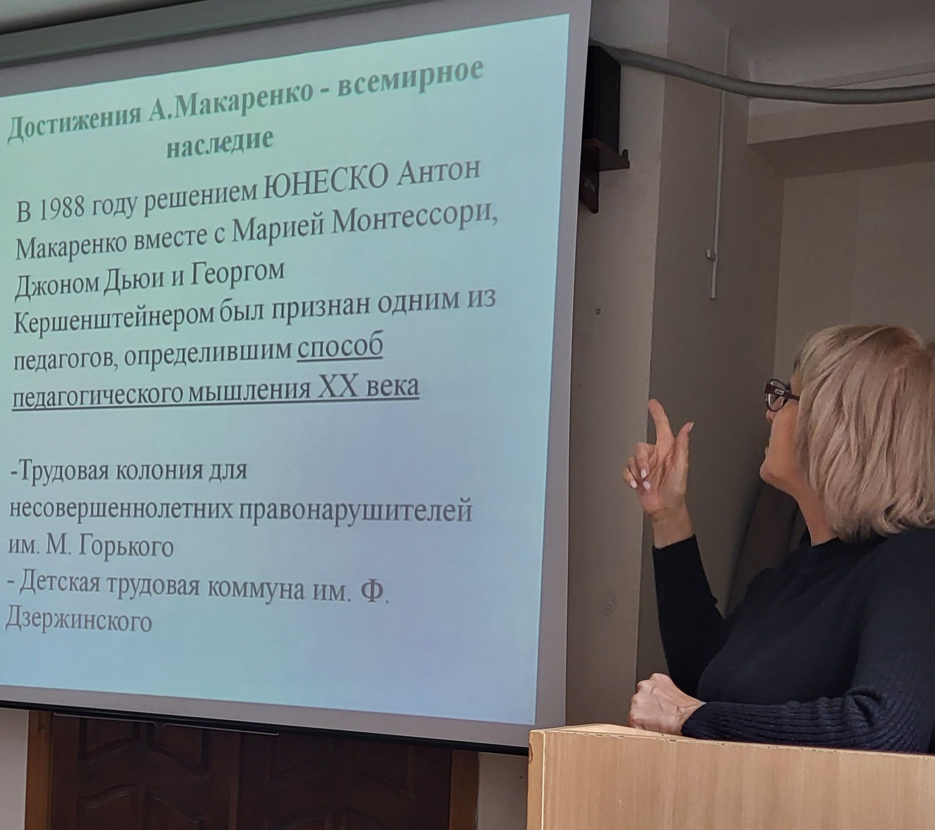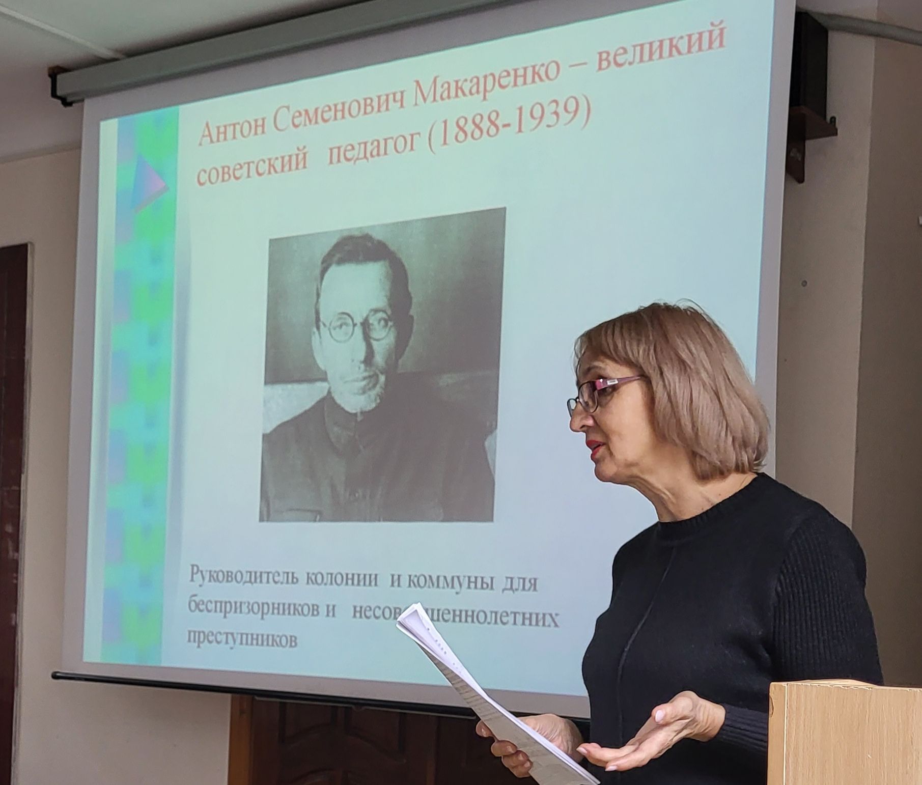 Заведующая кафедрой гуманитарных, социальных и естественнонаучных дисциплин, куратор первого курса по направлениям Менеджмент и Экономика Татьяна Павловна Штец рассказала о педагоге А.С. Макаренко, о разработанных им принципах воспитания.