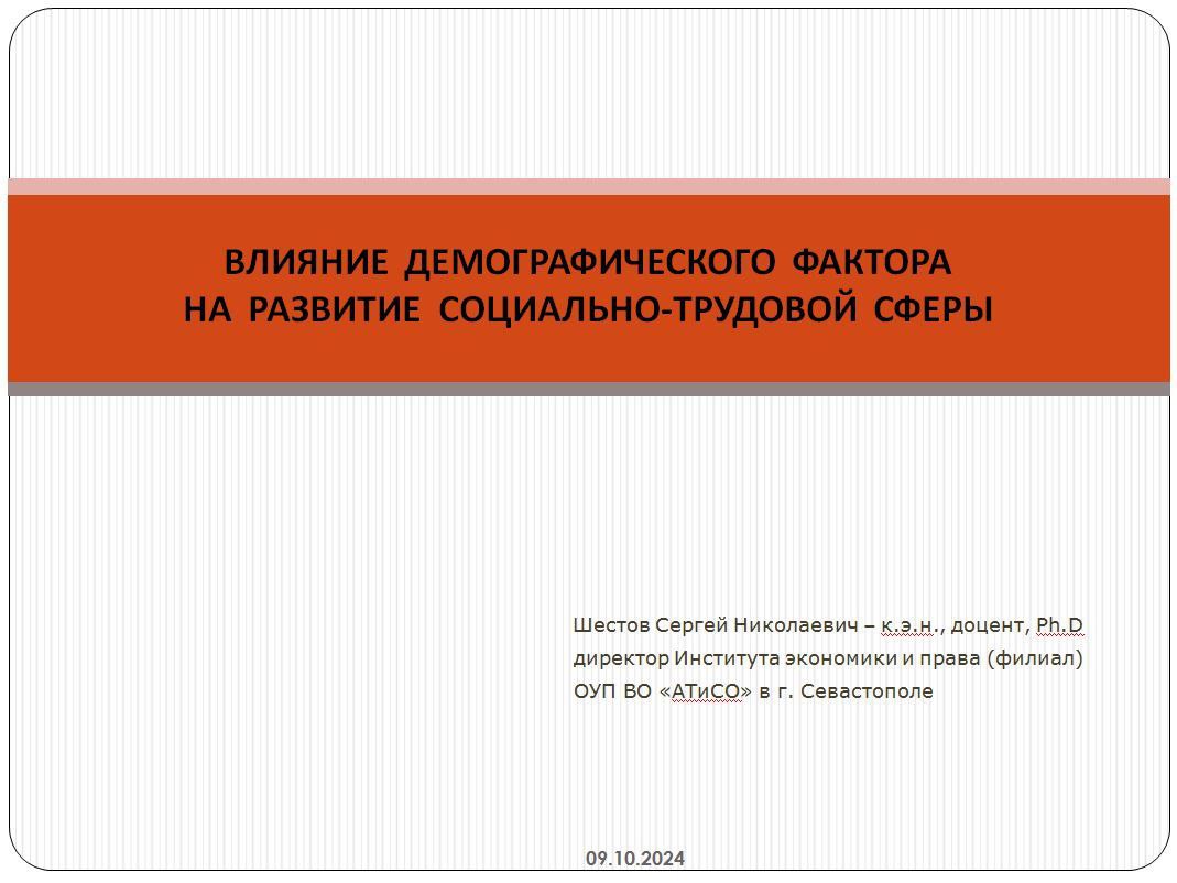 Директор института экономики и права (филиал) ОУП ВО "Академия труда и социальных отношений" в г.Севастополе Сергей Шестов выступил с докладом "Влияние демографического фактора на развитие социально-трудовой сферы" на 5-й Международной конференции "Костинские чтения", которая состоялась 9 октября 2024 года.