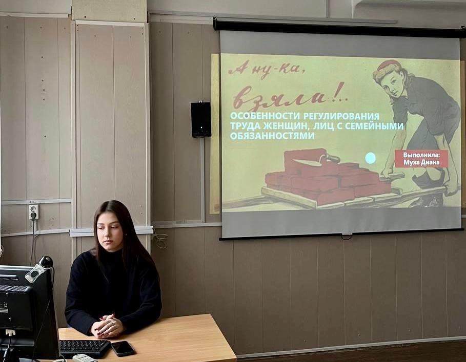 Модератором семинара выступила доцент кафедры правовых дисциплин, кандидат юридических наук Алина Большакова. Студенты представили презентации по актуальным проблемам правового регулирования труда.