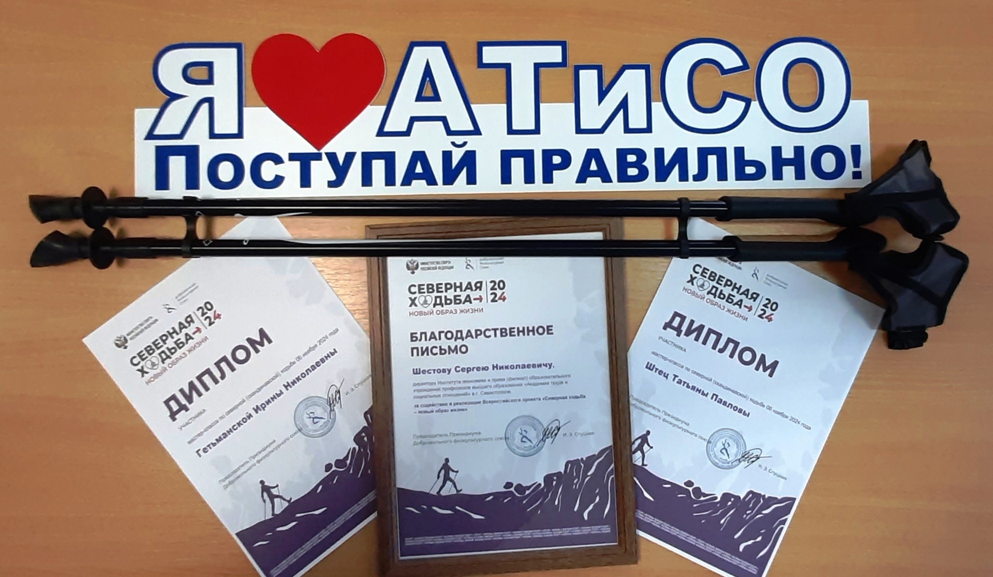 Благодарственное письмо на имя директора Института Сергея Шестова за содействие в реализации Всероссийского проекта «Северная ходьба – новый образ жизни» за подписью Председателя Президиума Добровольного физкультурного союза, заслуженного мастера спорта России, чемпионки мира и Европы, призёра Олимпийских игр Ирины Слуцкой вручил региональный представитель союза в городе Севастополе, педагог-инструктор по северной ходьбе, призёр соревнований по спортивному туризму в дисциплине «северная ходьба» профессор Владимир Обливанцов.