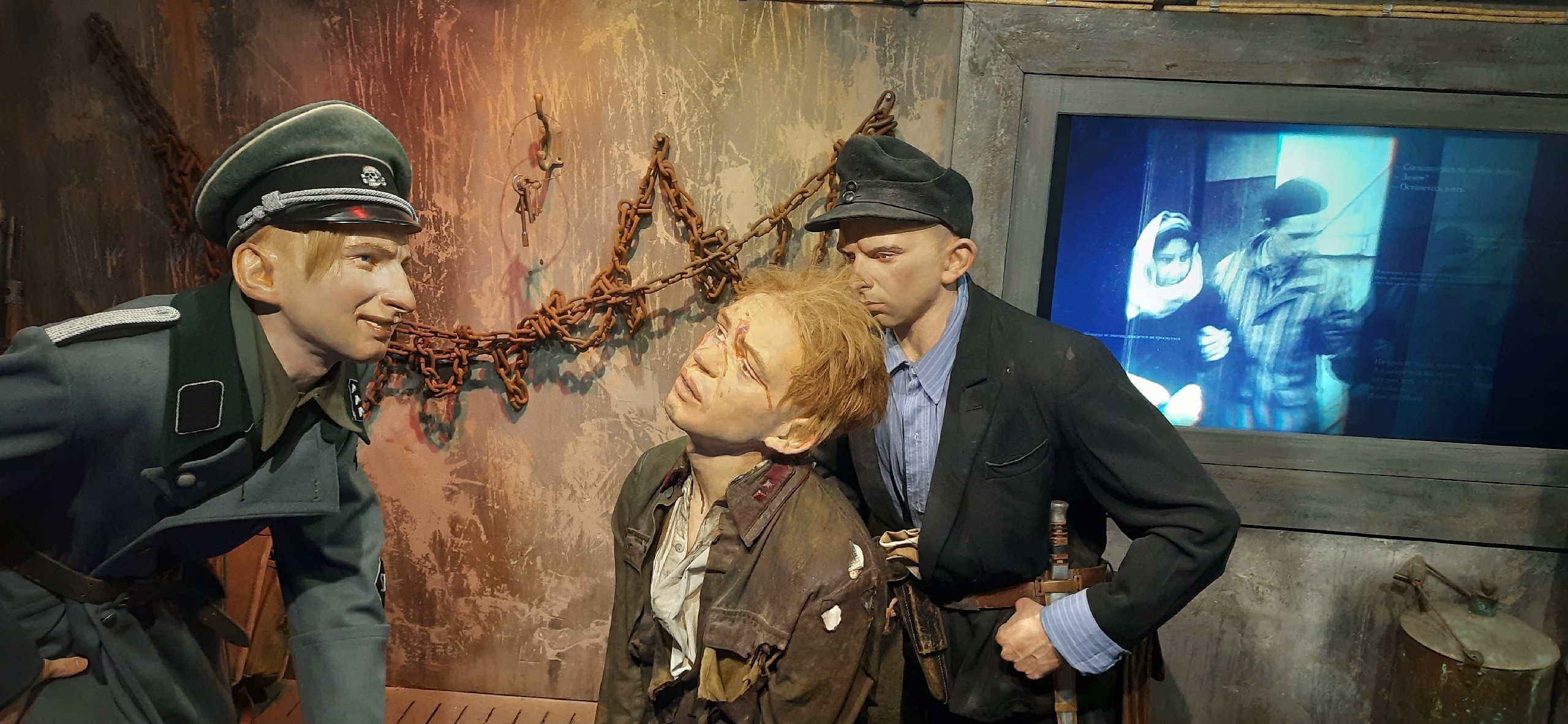Вот вагон с умирающими измождёнными узниками концлагеря, вот медицинский вагон с тяжело ранеными, вот газовая камера, а в ней ещё живые люди... А вот героические защитники Брестской крепости и надпись на кирпичной стене: "Умираем не срамя".
