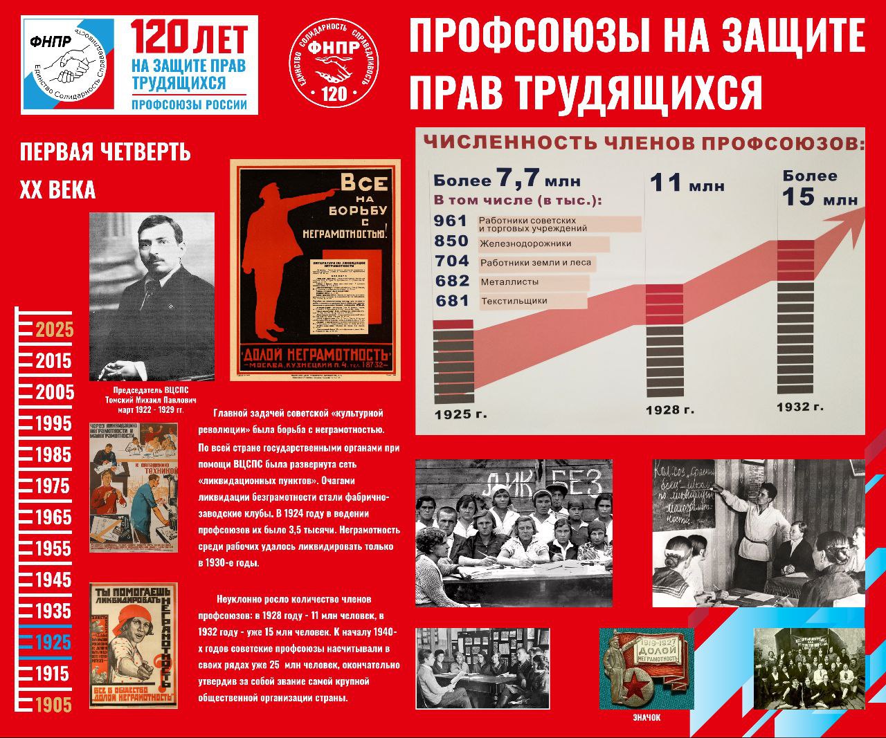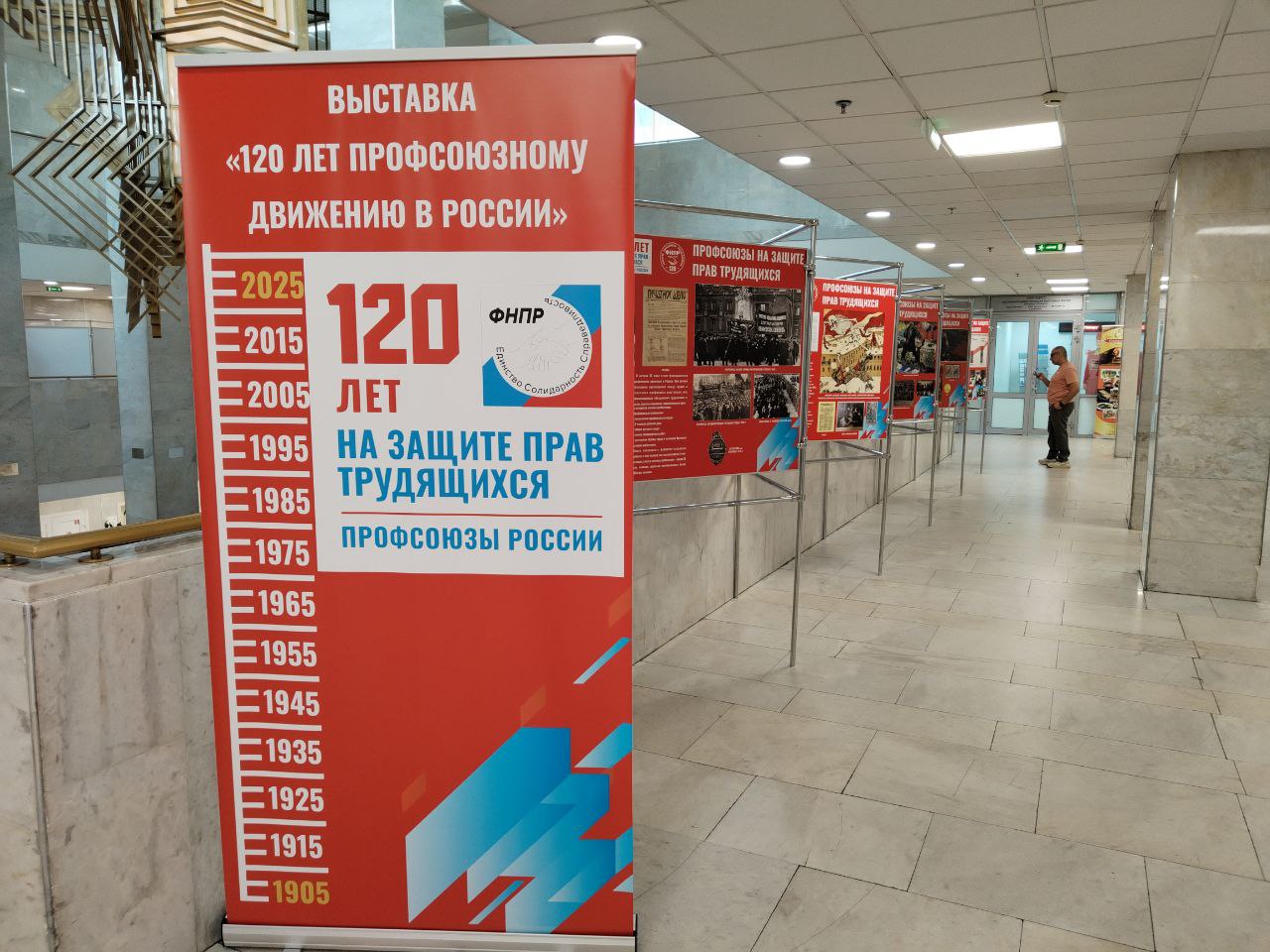 24 стенда рассказывают про исторический путь развития профсоюзов от становления рабочего движения в царской России и появления первых профсоюзных организаций до их борьбы за права работников на современном этапе.