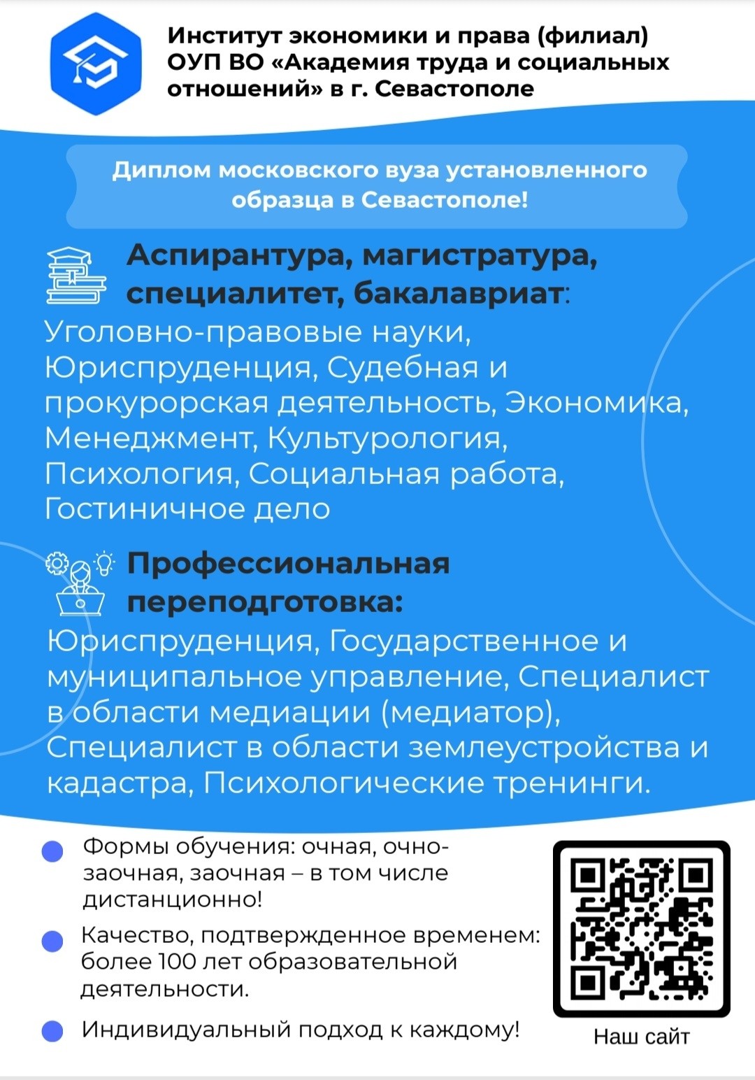 Московский диплом в Севастополе, по-настоящему качественное образование, индивидуальный подход к каждому и самый лучший дружный коллектив высокопрофессиональных преподавателей и замечательных студентов!