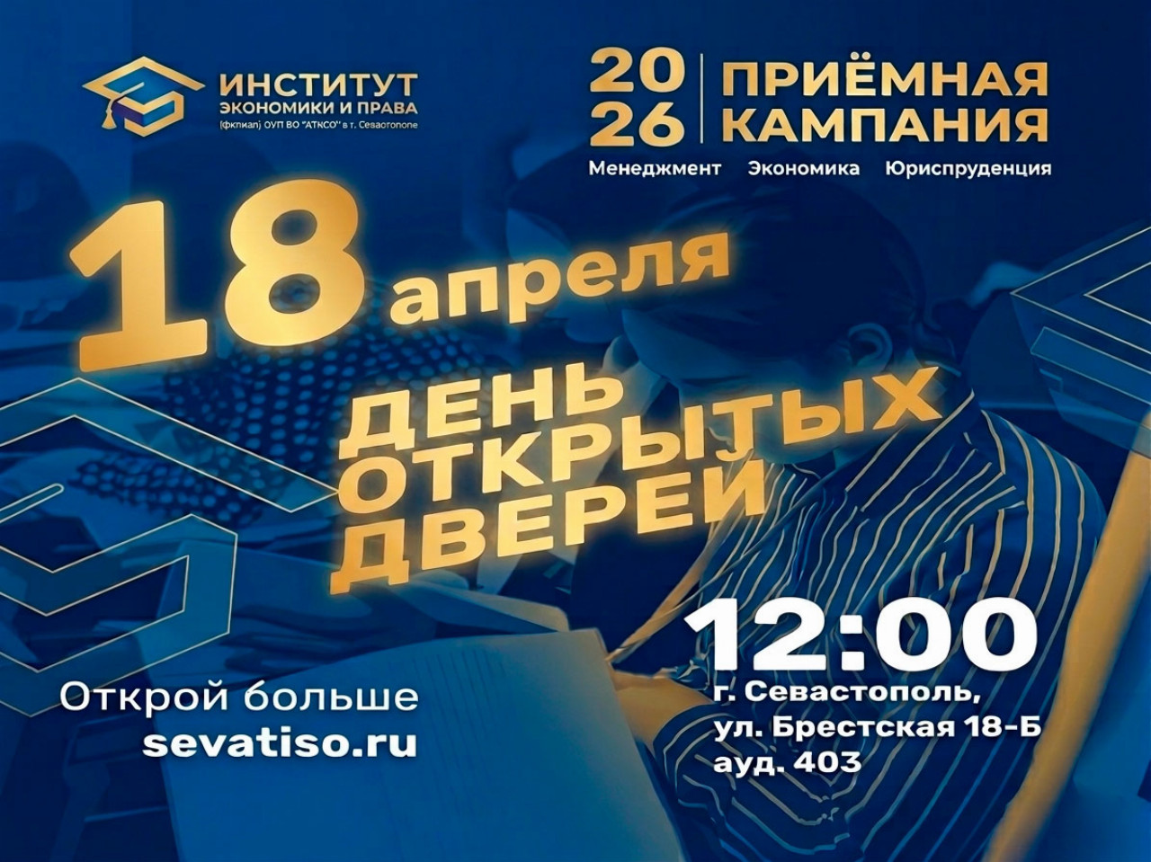 18 апреля 2026 г. в 12:00 Институт экономики и права (филиал) ОУП ВО «АТиСО» в г. Севастополе приглашает абитуриентов принять участие в Дне открытых дверей.